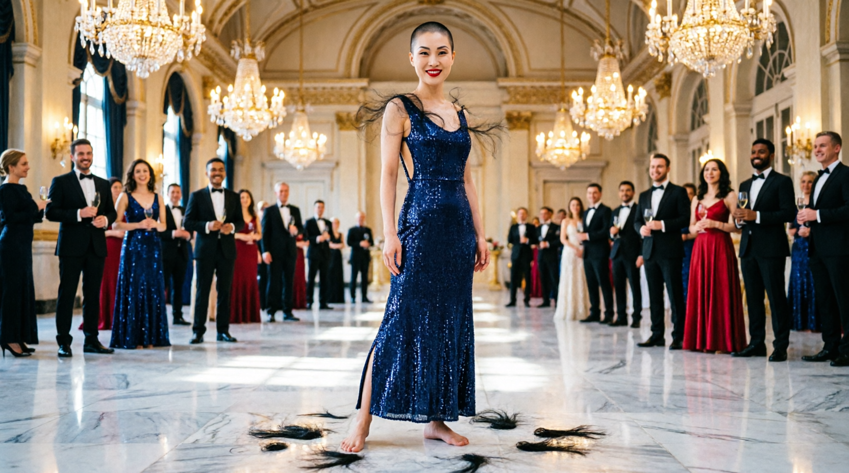 Conversations stop in waves. Forks pause. Champagne glasses hover midair. Nobody knows whether to stare or look away, which means they all do both. That is how corporate people handle disaster: badly, but in expensive clothes.