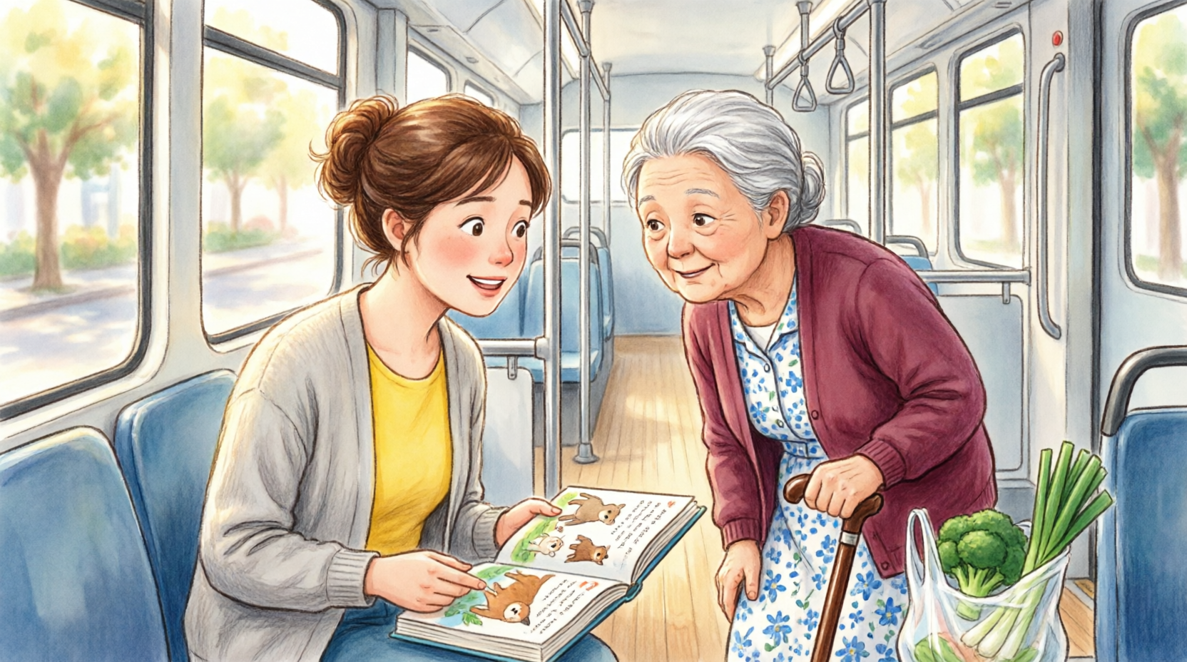 At the third stop, an elderly woman boards with grocery bags and a cane.