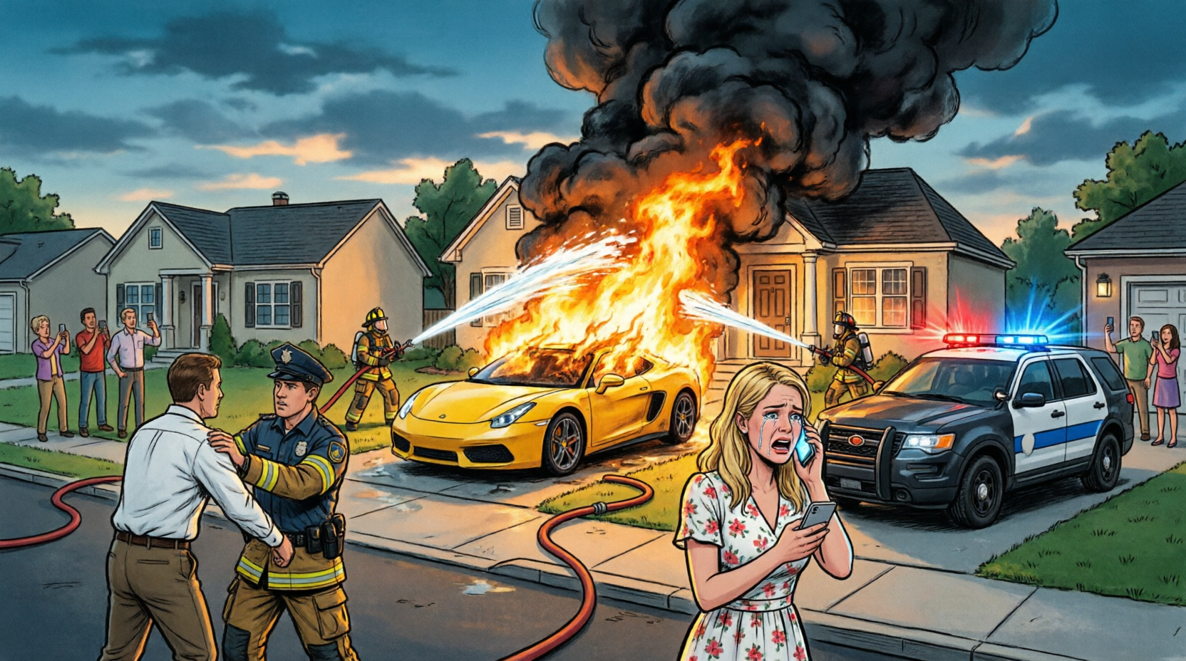 In my driveway, a yellow sports car was engulfed in flames.