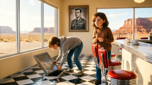 It was real. Five dollars and two thousand miles. And this was real. I pulled the keys from the envelope. Two brass keys on a simple metal ring. My hands were shaking as I approached the front door. The lock was stiff, but it turned. The door swung open with a creak that echoed through the empty building. And then we were inside. The smell hit first. Dust and old grease. Wood that had been baking in the summer sun and freezing in the winter cold for fifteen years. Something else underneath. Something organic and slightly sweet. Maybe rotting fabric. Maybe dead mice. Maybe just the smell of a place that had been forgotten. But beneath all of that, something else. Potential. The late-afternoon sunlight poured through the dusty windows, illuminating the interior in golden shafts. I could see motes of dust floating in the air, disturbed for the first time in years by our presence. The layout was exactly what you’d expect from a roadside diner. Booths lined the walls, upholstered in red vinyl that had cracked but not split. A long counter stretched across the back with chrome stools mounted to the floor. Behind the counter, a pass-through window opened into the kitchen. Everything was covered in a thick layer of dust. But beneath the dust, everything was intact. Coffee cups sat upside down near the register, waiting to be filled. Menus were stacked beside the cash register. Salt and pepper shakers stood at attention on every table. It was like stepping into a time capsule, like the last person to leave had just walked out for a smoke break and never came back. June walked slowly down the center aisle, trailing her fingers through the dust on the booth backs. Her eyes were wide, taking in every detail.