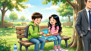 He breaks his expensive sandwich in half and hands one piece to the girl. He lines up fruit between them as if he has done this many times. He passes over a juice carton, and the two of them eat and talk with the easy rhythm of people who already know each other’s silences. Miguel remains still, one hand braced against the tree bark, watching his son laugh with this unknown child while the city hums on, oblivious.