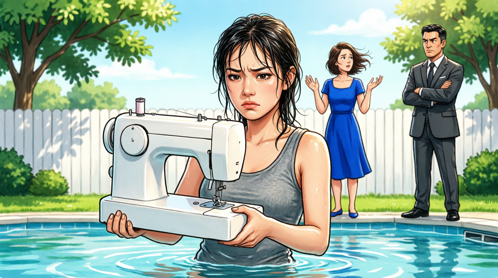 Lily dropped to her knees beside the pool, reaching helplessly toward the water as her sewing machine disappeared beneath the surface. It had taken her six months to save for it—babysitting, selling handmade tote bags online, cutting every corner she could. That machine was her dream, her escape.