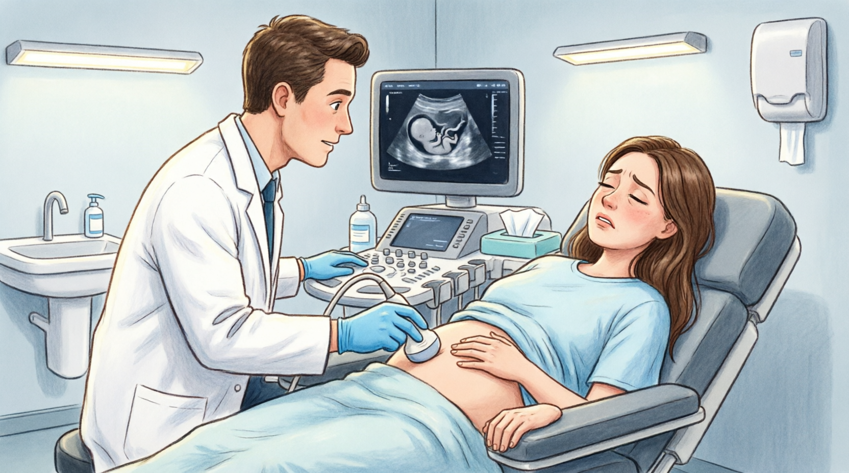 Dr. Oakley walked back to the monitor and pointed to an irregular dark shape visible in the uterine area, his finger hovering without touching the screen.