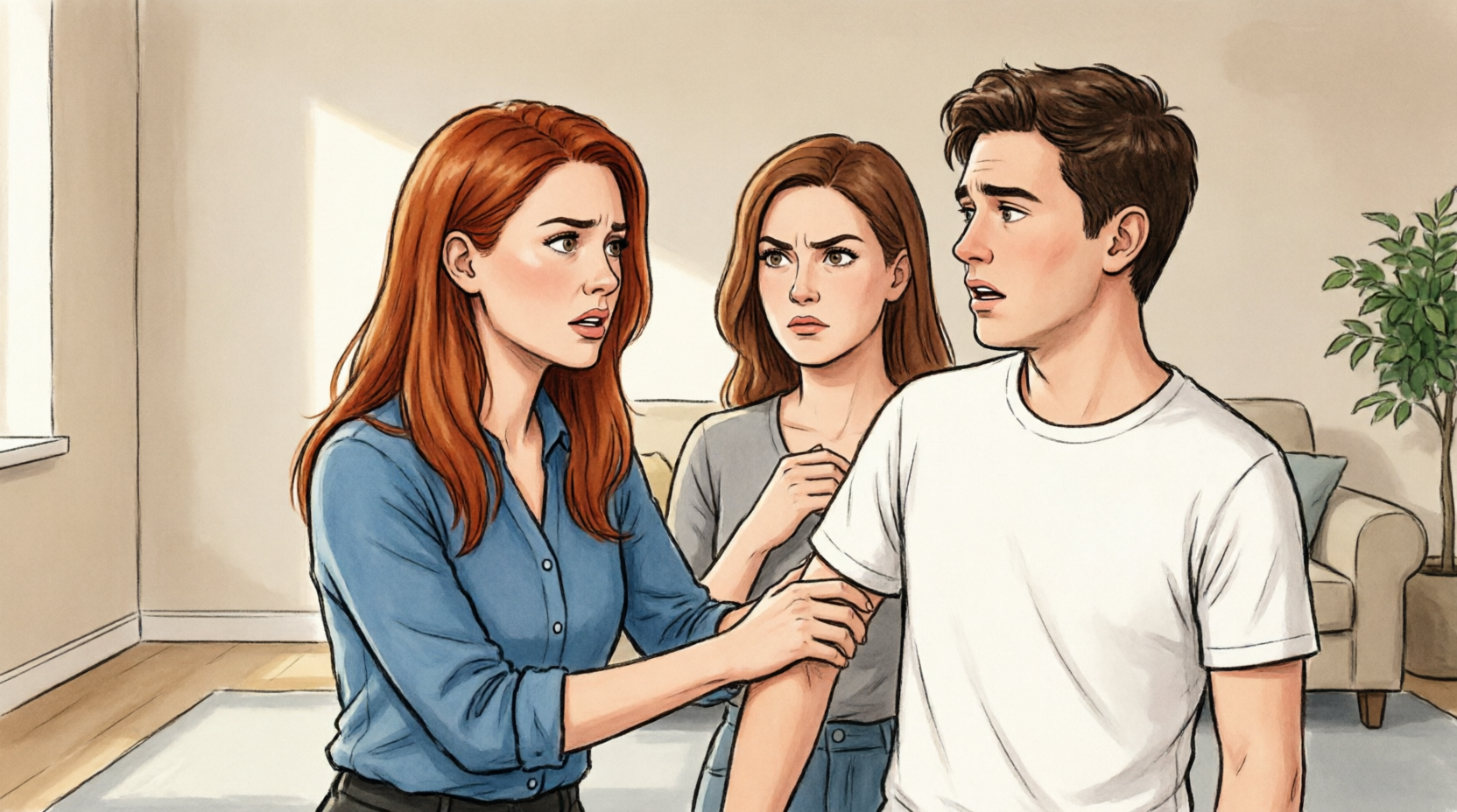 From the hallway, a woman’s voice cuts in sharp as broken glass.
