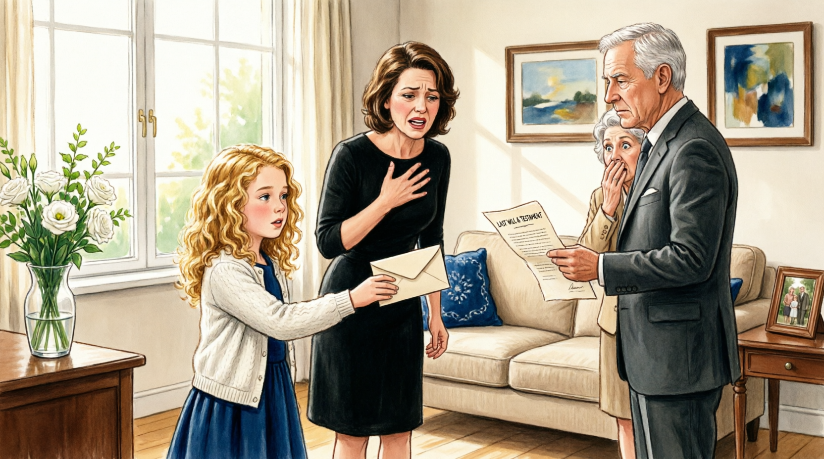 Before I could speak, Lily stepped out from the hallway in her navy cardigan, holding a sealed manila envelope in both hands. She looked straight at them and said, in a voice far too calm for an eight-year-old, “This is what you came for.”